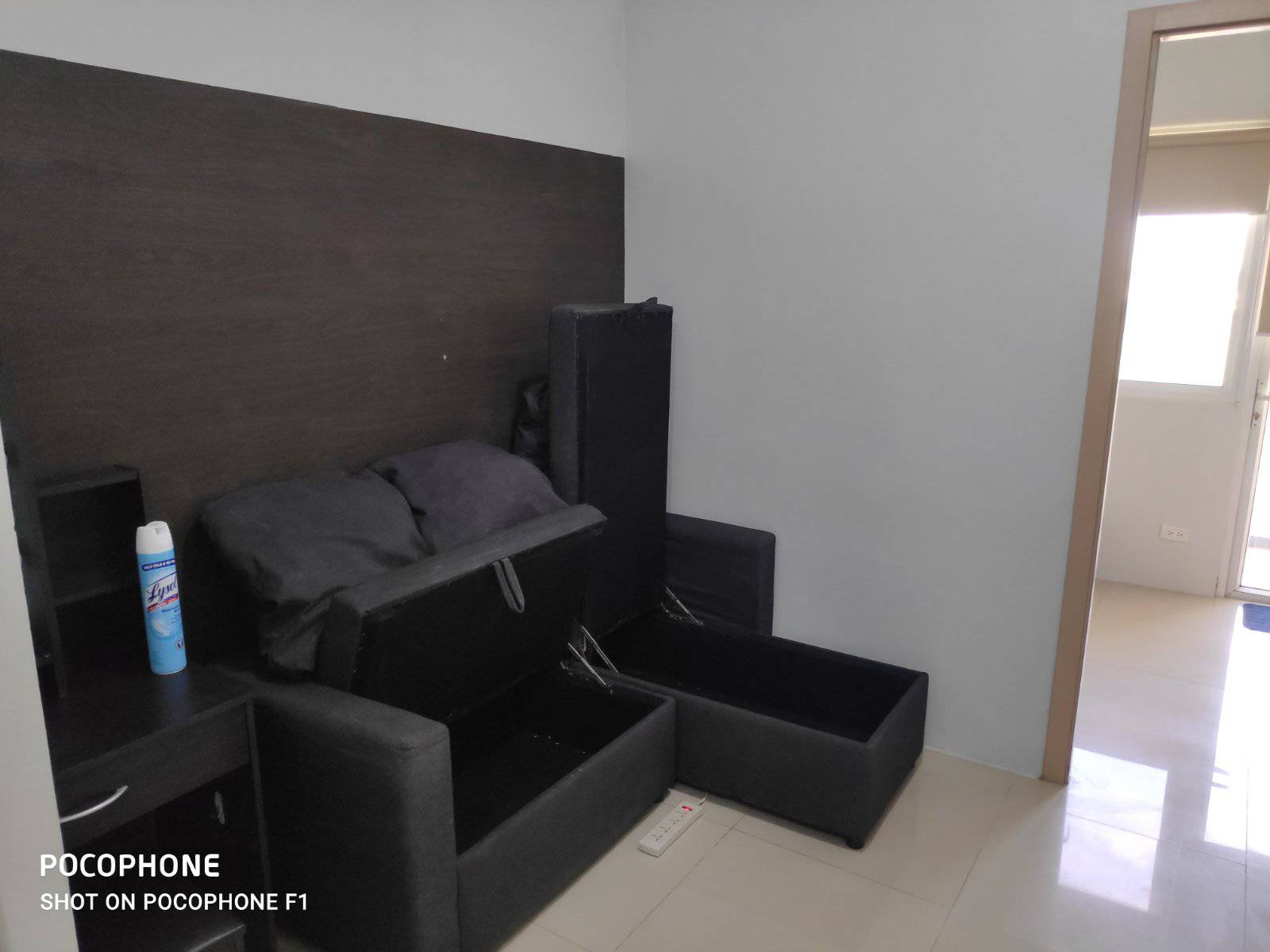27.68 sqm unit with balcony -double size bed with mattress -heated shower -sofa with storage -cabinet -electric stove and kettle -electric fan -aircon -1 toilet and bath